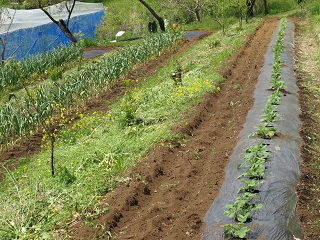 株まわりに堆肥をほどこし、うね間には牧草をまいて